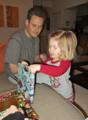 We began our festivities on Christmas Eve with church at 4 PM (Yay us!) followed by take-out Thai food (we felt this was an upgrade over last years’ pizza). Christmas Eve is my family’s big night of celebrating, so we skyped with them and Nia opened a boatload of presents from my parents and sisters.